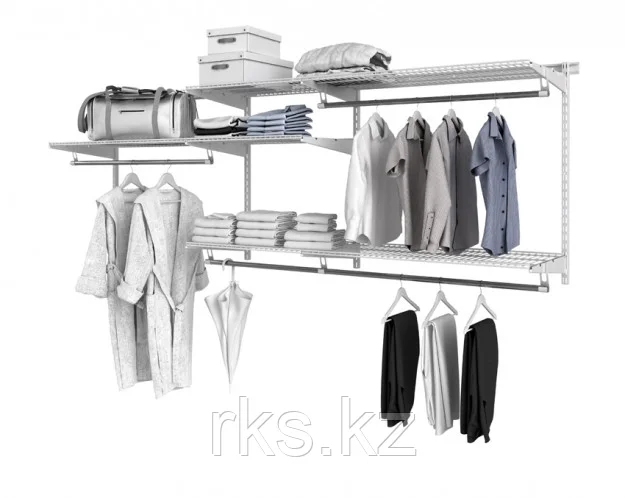 Комплекты гардеробной системы Титан GS - 350 и Титан GS-450 - это готовое решение. Система собирается в 5 разных конфигурациях, что позволяет подстраивать ее под размеры помещения и ориентироваться на личные пожелания по расположению отдельных элементов. В комплект входят несущие рельсы и навесные направляющие, полки, штанги, аксессуары, крепежные элементы. Можно докупить множество дополнительных компонентов для гардеробной системы.